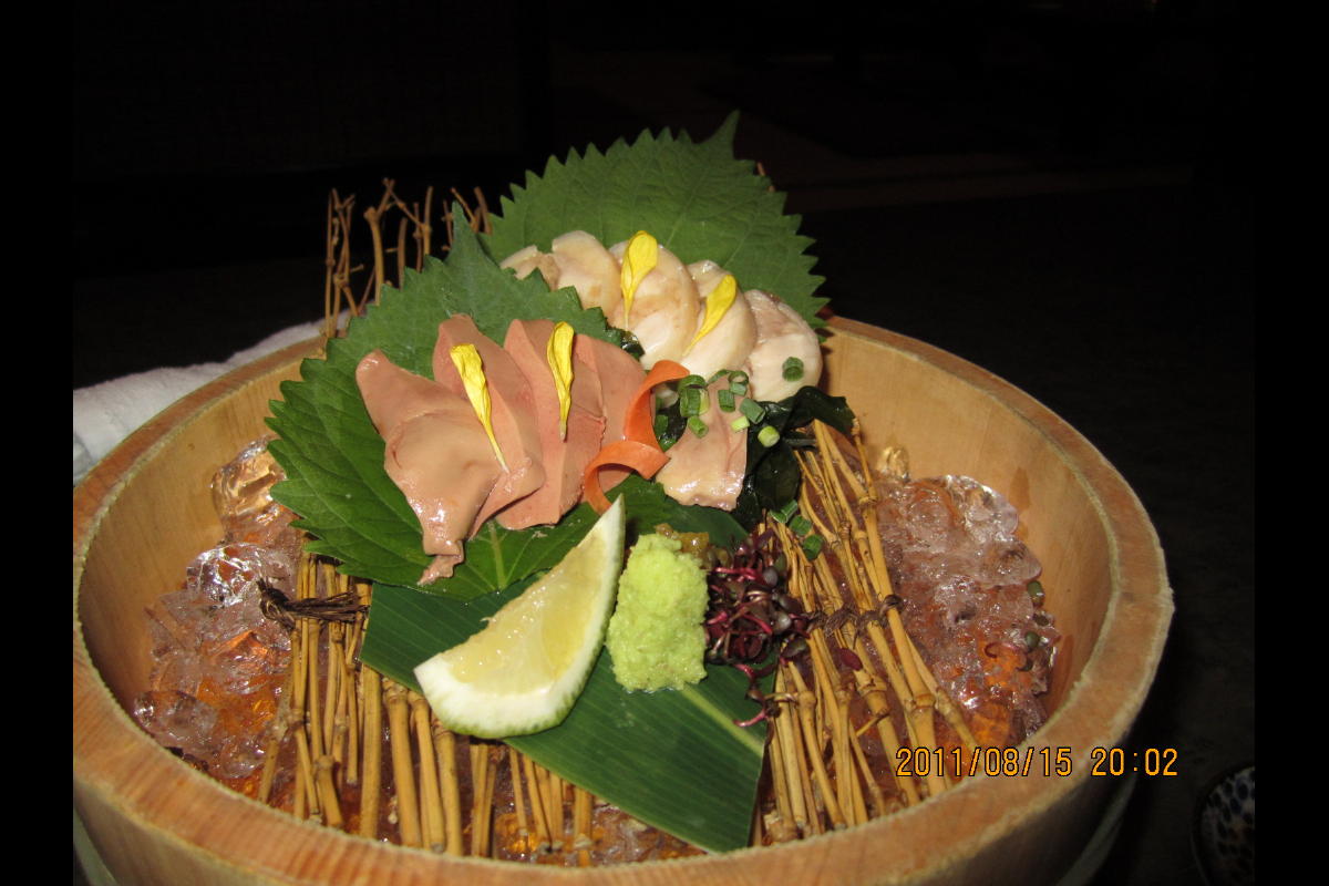 画像は、鶏の肝やらなんやら(忘れた)の刺身。超絶に美味しい。